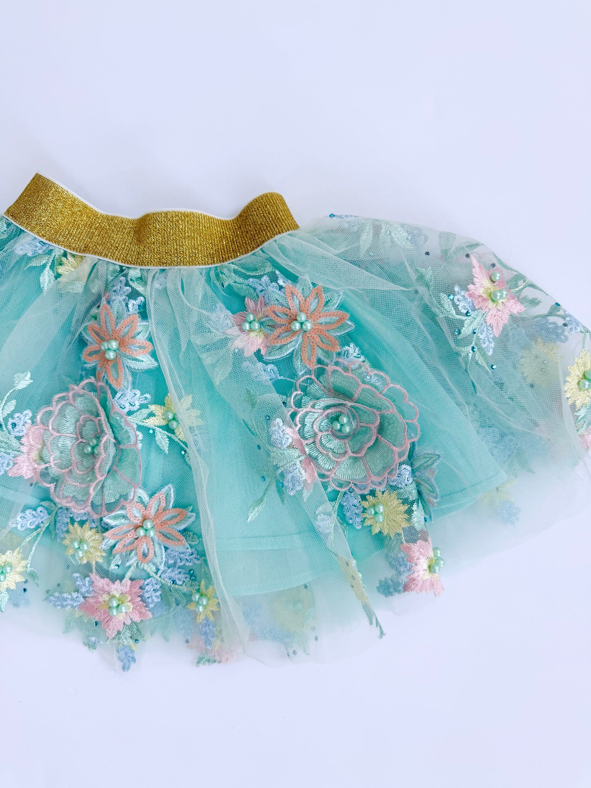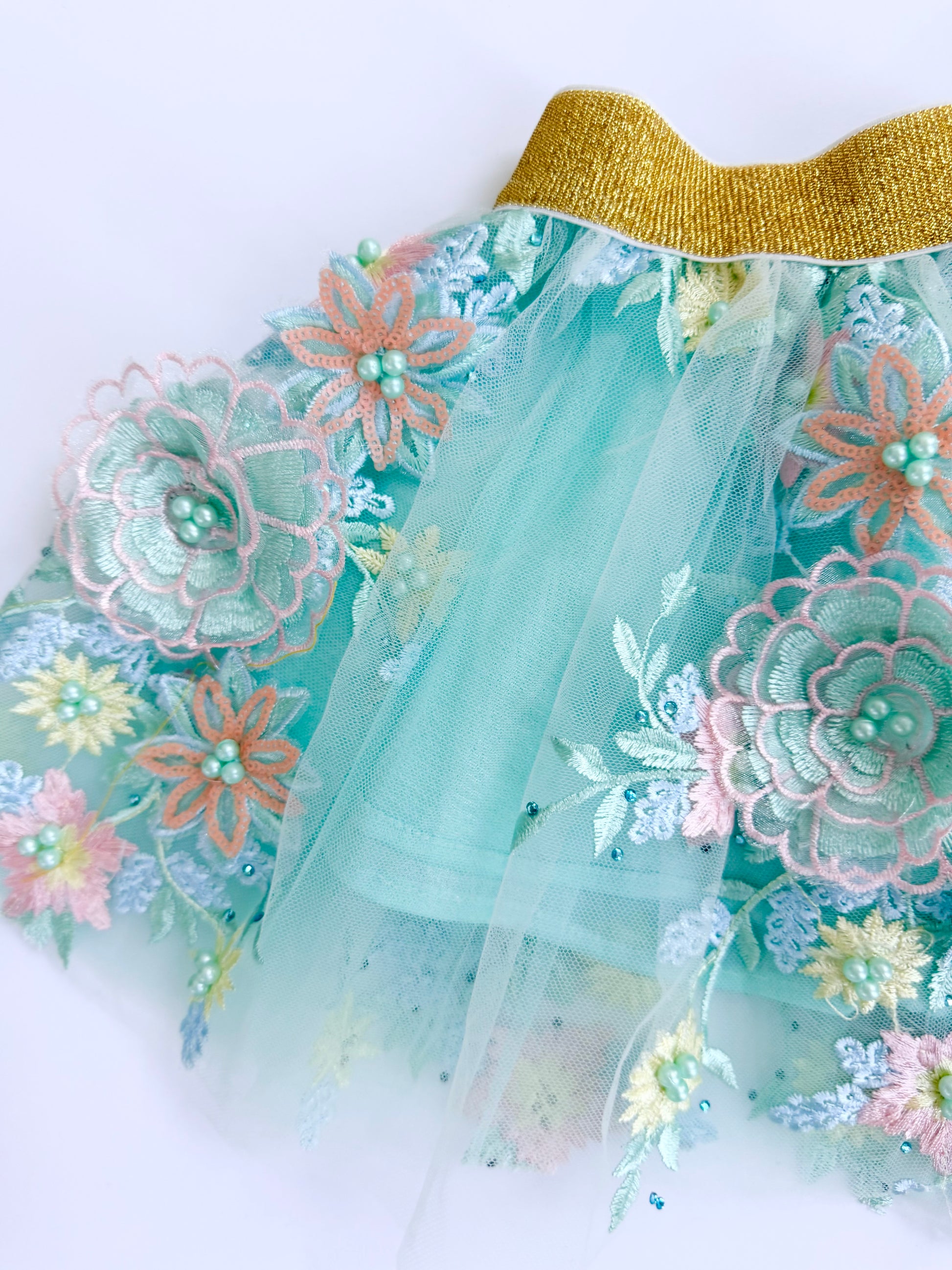 MATCHING TUTU SKIRT SIZES: (Made with elastic metallic gold waistband and 3D embroidered lace fabric)